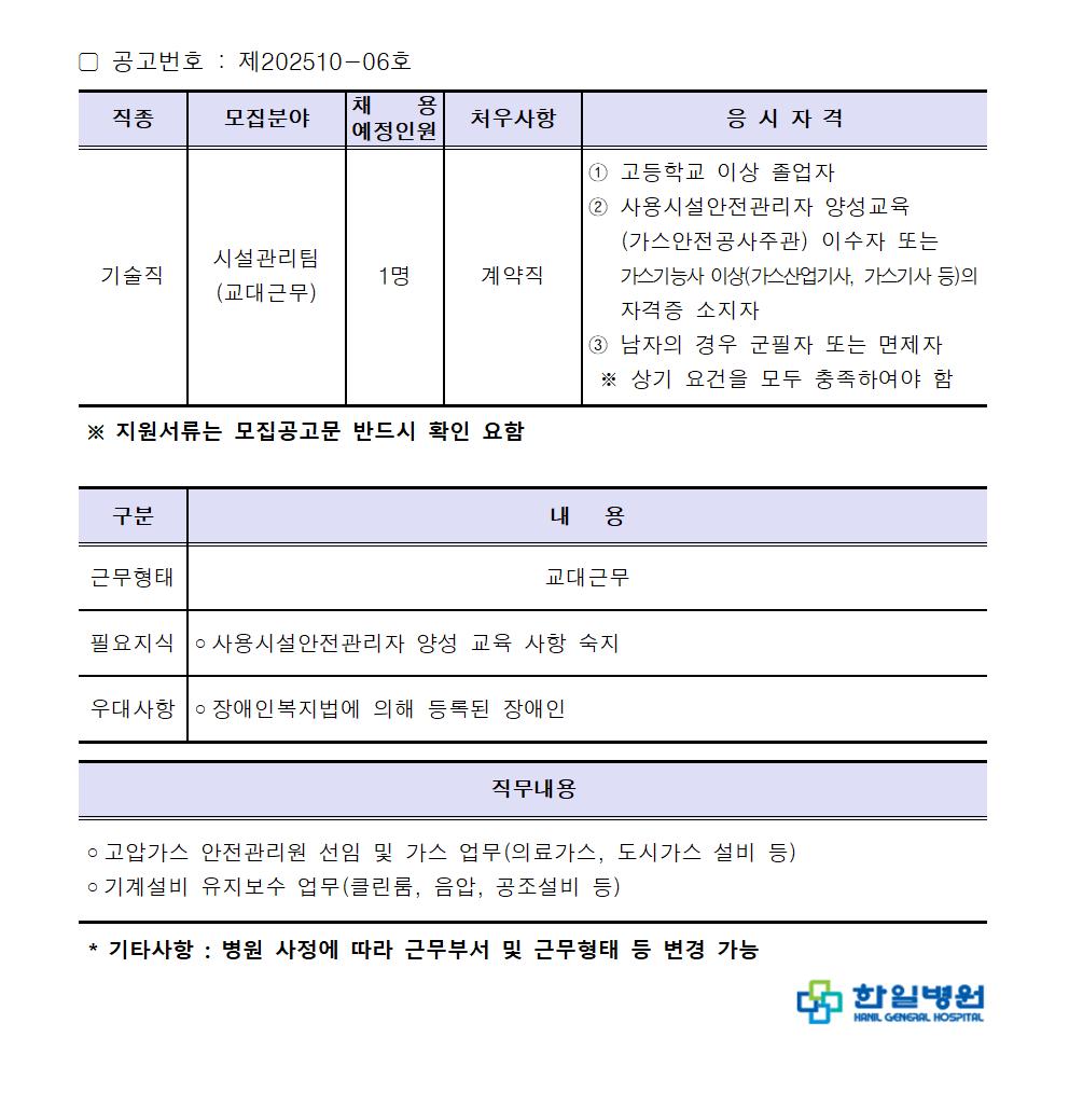 | 채용공고명 | [ 온라인 ] 기술지원부 시설관리팀 직원 채용 | ||||