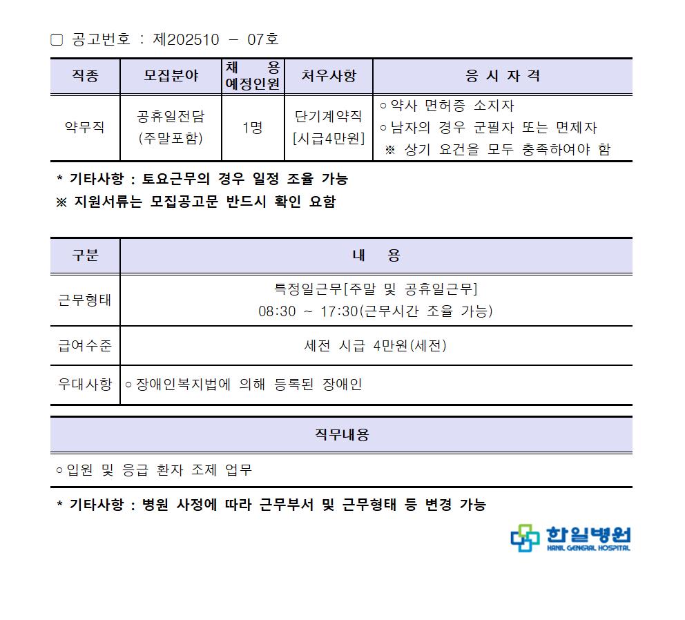| 채용공고명 | [ 온라인 ] 약제팀 공휴일전담(주말포함) 약사 채용 | ||||