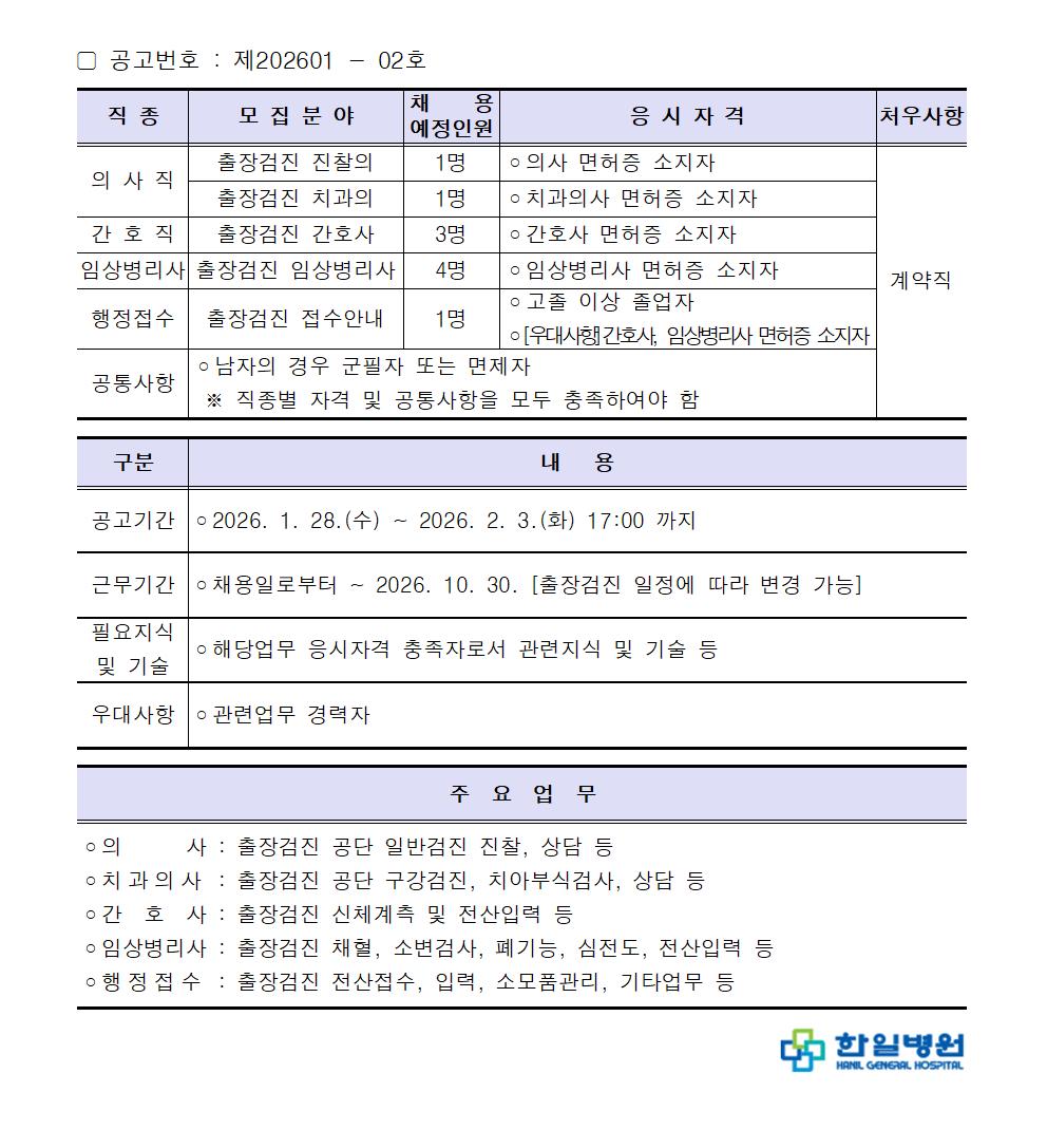 | 모집 직종 | 일반의, 치과의, 사무직, 의료기사직, 간호직, | ||||
