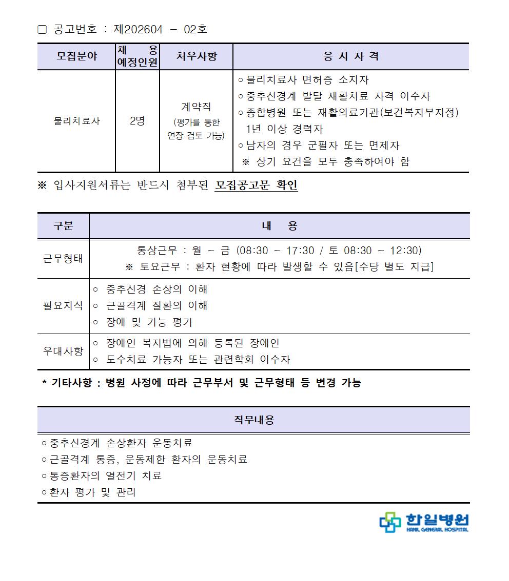 | 채용공고명 | [ 온라인 ] 재활치료팀 물리치료사 모집 | ||||